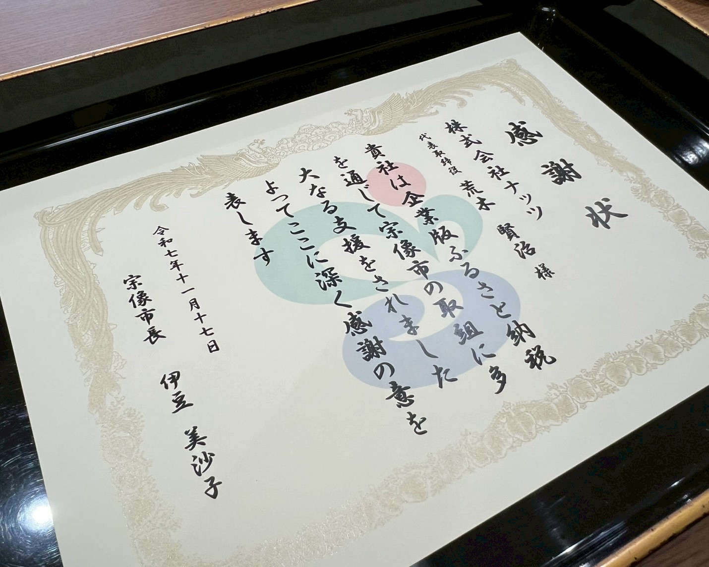 この度、株式会社ナッツは、福岡県宗像市の「企業版ふるさと納税」を活用した1000万円の寄付をさせていただき、宗像市長より感謝状をいただきました。